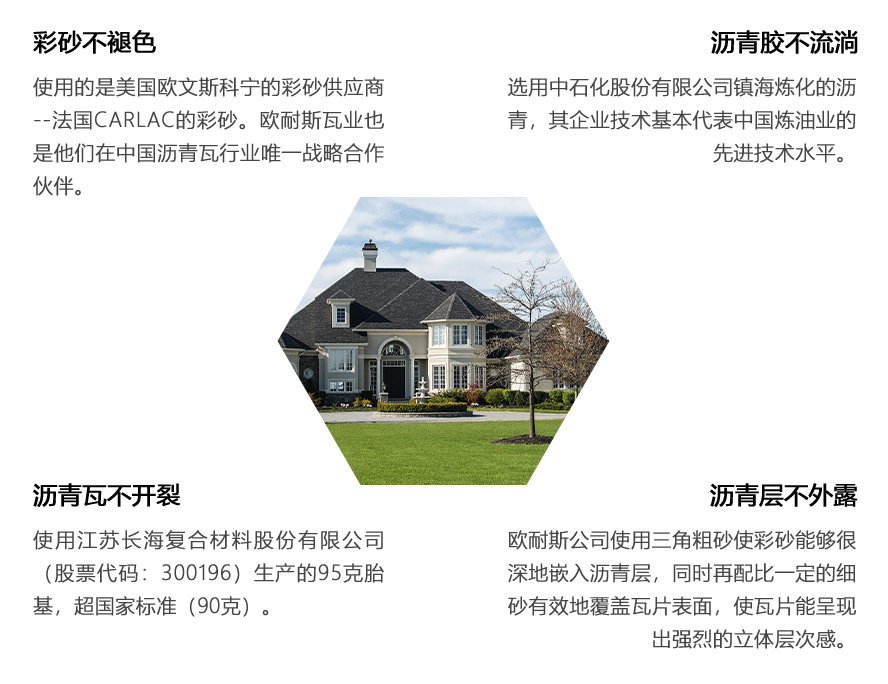 • 瀝青瓦不開裂使用江蘇長海復合材料股份有限公司(股票代碼:300196)生產的95克胎基,超國家標準(90克)。